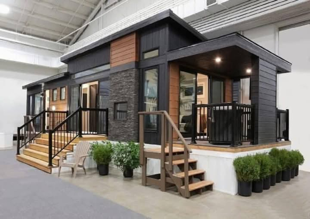 This modern container tiny home, crafted by MAQHomes, blends contemporary design with functional living. Featuring a sleek exterior with large windows and a covered porch, it’s perfect for individuals or small families seeking a mobile, sustainable housing solution with style and comfort. The home includes two bedrooms (main and bunk) on a single ground floor.
