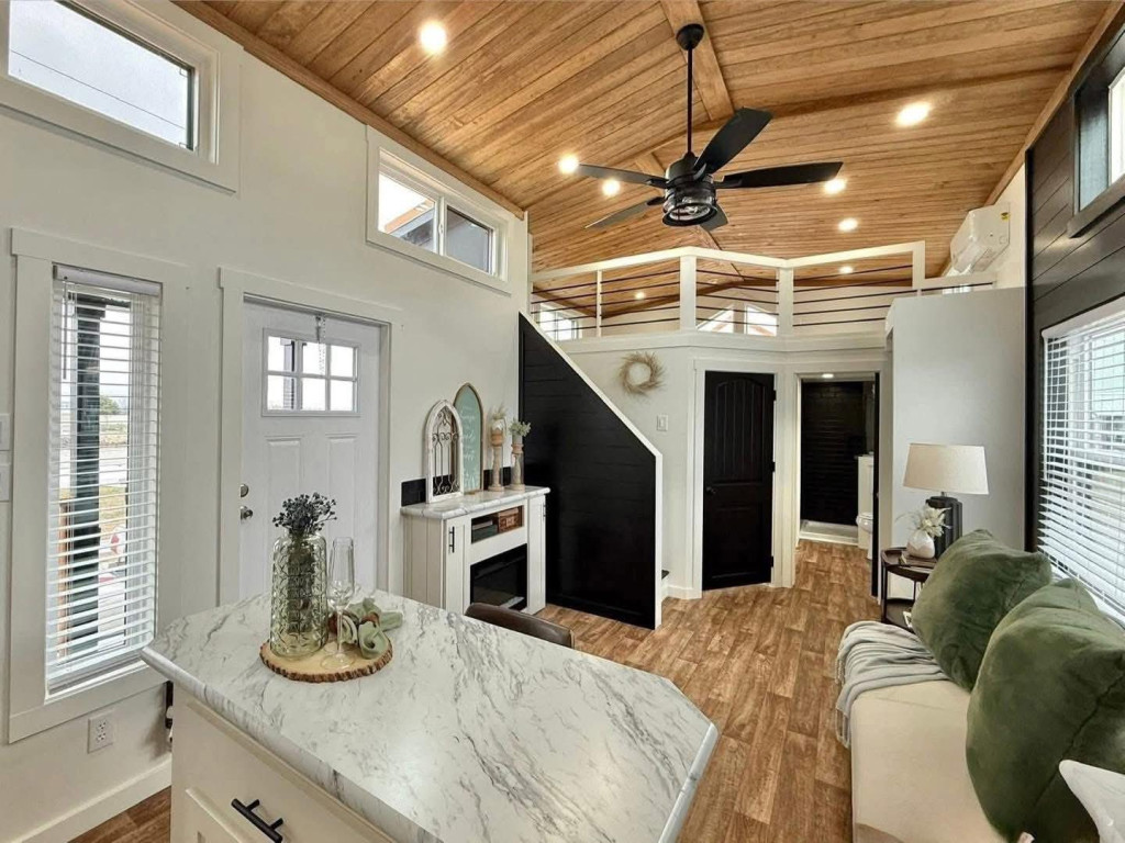 This model has painted black shiplap accent walls and cedar stained ceilings.