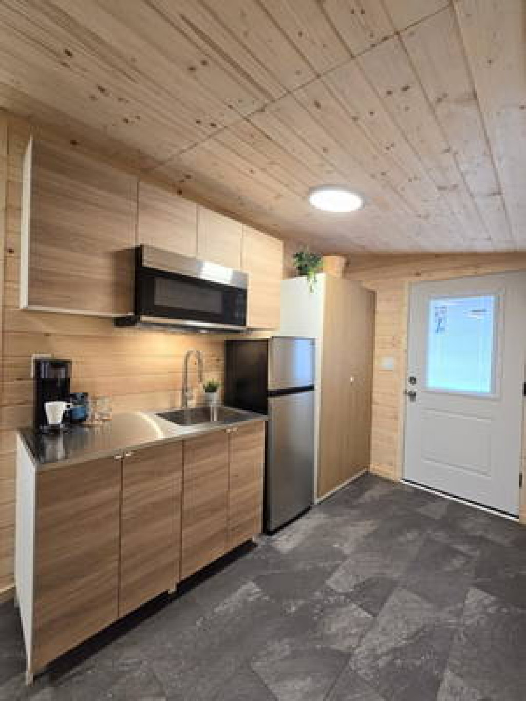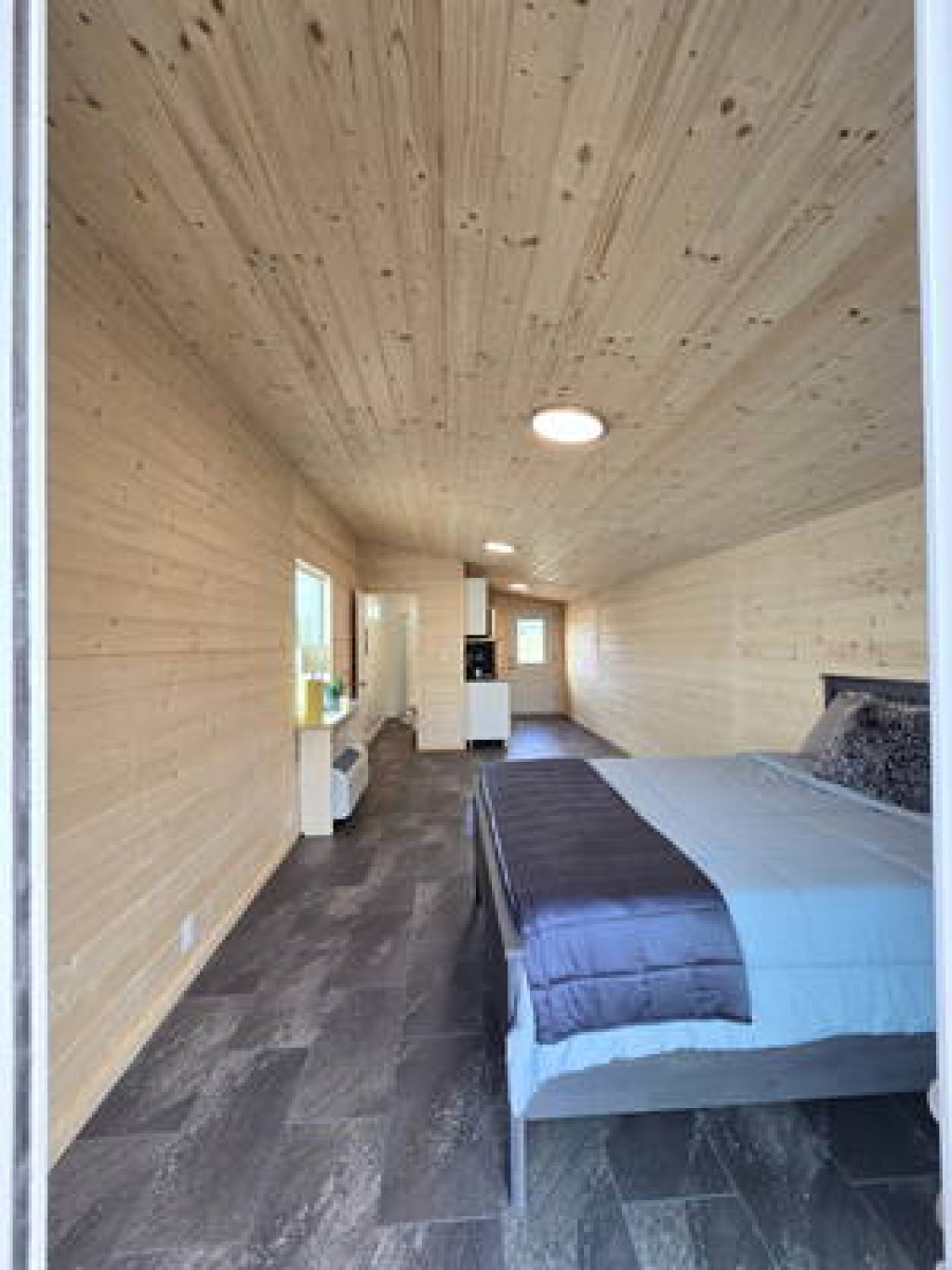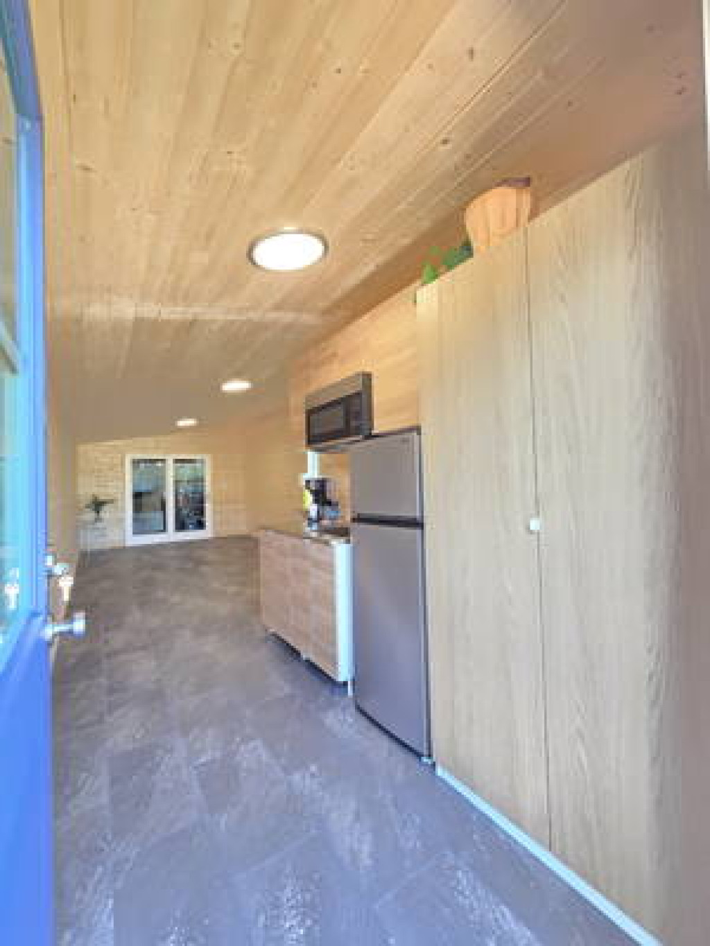 6' kitchenette w/ full size microwave, large wardrobe, 4x4 picture window, 6' sliding glass door (fiberglass not cheap vinyl) leading out to a 4x12 porch. The front door has internal blinds. Lifetime warrantied flooring, standing seam galvalume metal roof/siding, 50 year warranted board and batten siding with high end Sherwin Williams paint that will last decades , closed cell foam insulation, quiet and efficient VRF heat pump for A/C & heat. Walls are clad in 3/4" thick, solid wood shiplap that you can hang anything on and not have to worry about trying to find a stud. On demand water heater for unlimited hot water!